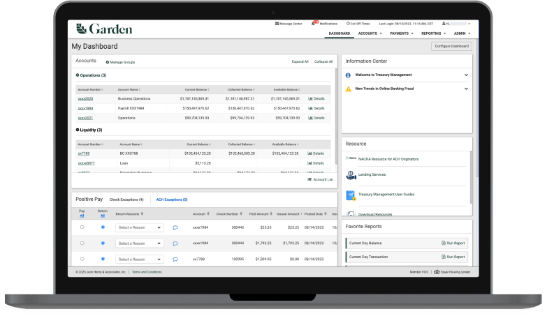 Stay on top of your cash flow. Easily access a wide range of customizable reports—from daily transactions to balance summaries for any date range. With Treasury Management reporting, you can:
